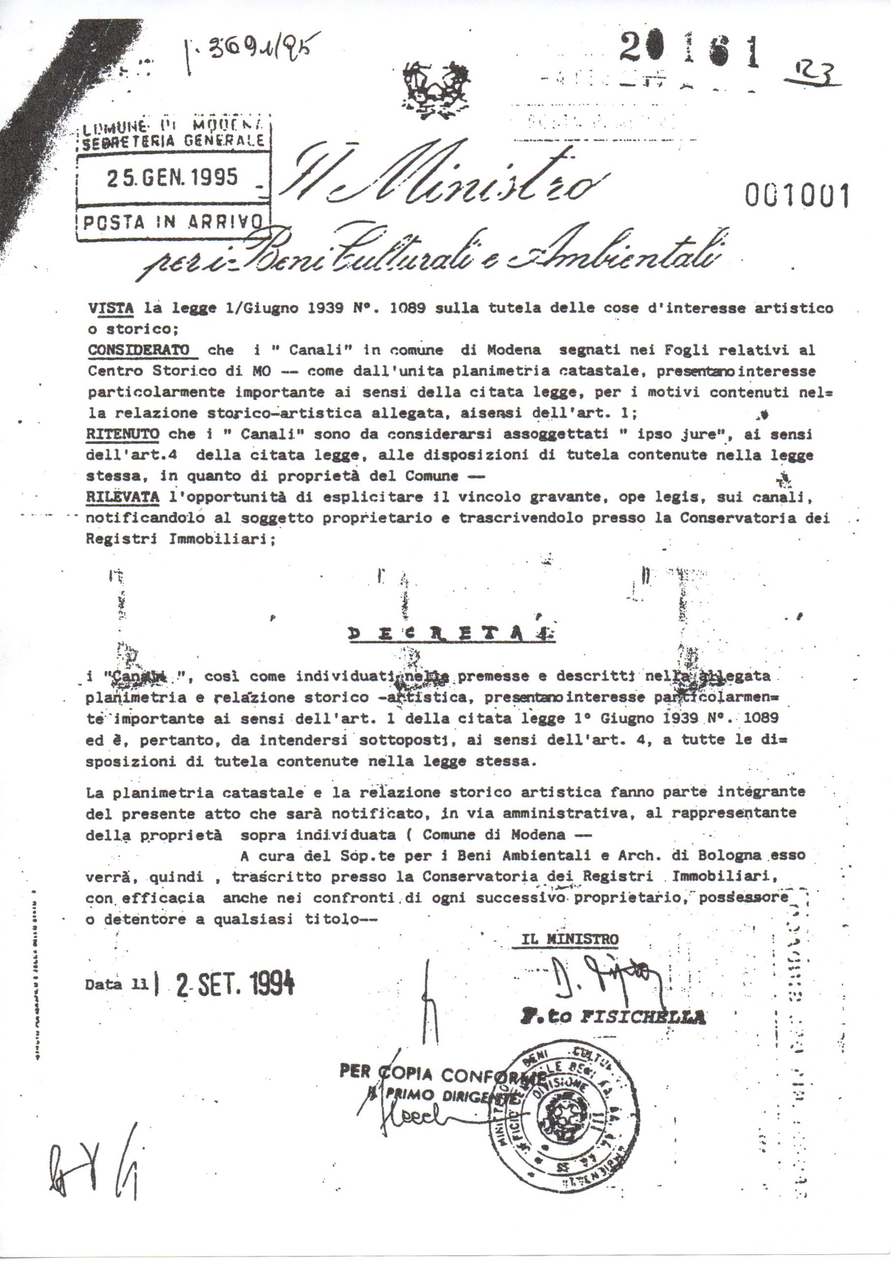 I canali che scorrono nel sottosuolo della Modena antica e danno il nome alle sue strade (Canalchiaro, Canalgrande, Canalino, nella odonomastica cittadina) furono riconosciuti di interesse storico e artistico particolarmente importante con decreto ministeriale del settembre 1994, quindi assoggettati alla disciplina del codice dei beni culturali, nel dichiarato proposito di “mantenere intatte le strutture architettoniche e costruttive” dei principali canali che attraversano il centro storico, coperti e “voltati” tra Cinquecento e Settecento. E la Soprintendenza Archeologia belle arti e paesaggio è istituzionalmente chiamata a far osservare quella vincolante disciplina conservativa.