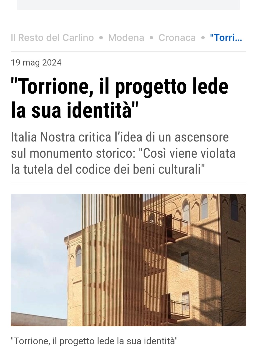 Già Italia Nostra aveva espresso la propria valutazione critica sul tema oggetto del bando di concorso promosso dal Comune di Carpi per il progetto di un nuovo collegamento verticale della Torre, da realizzarsi come autonoma struttura esterna (idonea a contenere scala e ascensore) in adeguato distacco dal fronte interno dell’edificio, con passerelle di raccordo ad ogni piano e accesso attraverso nuove apposite aperture nel compatto paramento in mattoni a vista. Il tema messo a concorso implica infatti la valutazione di compatibilità con i principi di tutela di quella soluzione che sacrifica la condizione essenziale di isolamento della Torre, altera il rapporto spaziale di contesto entro l’articolato insediamento del Palazzo dei Pio, modifica l’assetto funzionale dell’edificio, lede la integrità fisica della compagine muraria del fronte interno forata dalle aperture ai piani. E implica insieme la valutazione di compatibilità della nuova prevista destinazione che comporta una simile offesa alla identità stessa della Torre. Ora la Stampa locale, su documentata informazione della Amministrazione comunale, dà notizia del progetto vincente e ne pubblica la rappresentazione grafica. Neppure è ammissibile la valutazione nel merito del progetto prescelto, quando rimane ferma e insuperabile la eccezione pregiudiziale della incompatibilità con i principi della tutela (ai quali è subordinata ogni proposta valorizzazione) di una così radicale trasformazione del monumento, che si riflette, con il vasto ingombro della nuova struttura di servizio, sul contesto unitario del quattrocentesco insediamento del Palazzo. Un intervento insomma in palese violazione della disciplina di tutela del codice dei beni culturali (la conservazione, prima istanza della tutela) e perfino punito dal codice penale, finalmente adeguato con la riforma del marzo 2022 al rango costituzionale del patrimonio, speciale bene protetto (art.518-duodecies). Italia Nostra crede insuperabili le ragioni che si oppongono alla attuazione della soluzione innovativa selezionata nell’improprio concorso e pone l’esigenza che sia attivata la competenza consultiva del Comitato tecnico scientifico del ministero sul proposto intervento che incide, alterandone gli interni equilibri compositivi, sul quattrocentesco insediamento del Palazzo dei Pio.